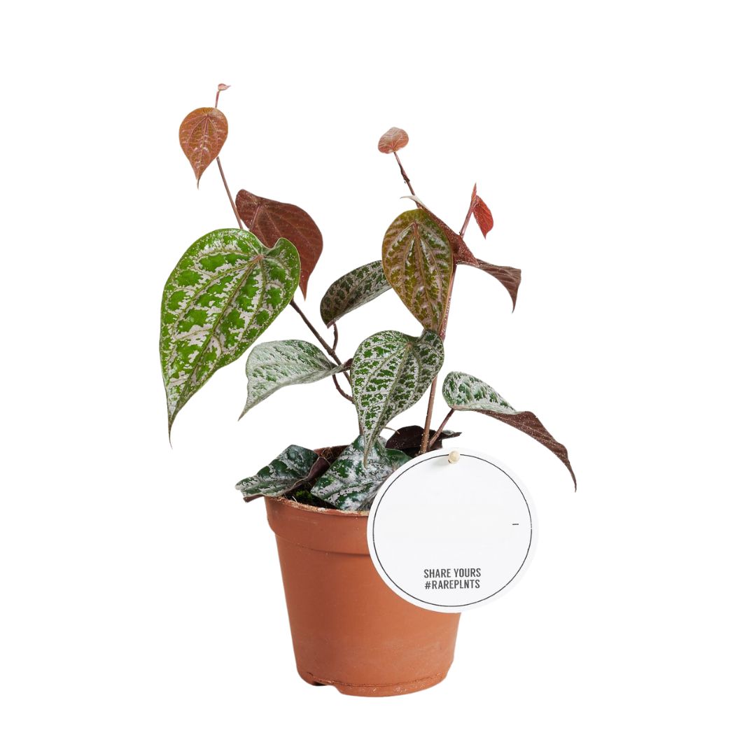 Piper crocatum , auch bekannt als Celebes-Pfeffer oder auch als Metallischer Pfeffer, ist eine auffällige und begehrte Kletterpflanze, die für ihre wunderschön gemusterten, herzförmigen Blätter geschätzt wird. Diese Piper -Art zeichnet sich durch tiefgrüne Blätter mit auffälliger, oft metallisch wirkender Panaschierung in Rosa-, Rot- oder Silbertönen aus. Die Panaschierungsmuster können variieren, wodurch jedes Blatt einzigartig wird und seine Attraktivität noch weiter steigert. Sie gehört zur Familie der Piperaceae.