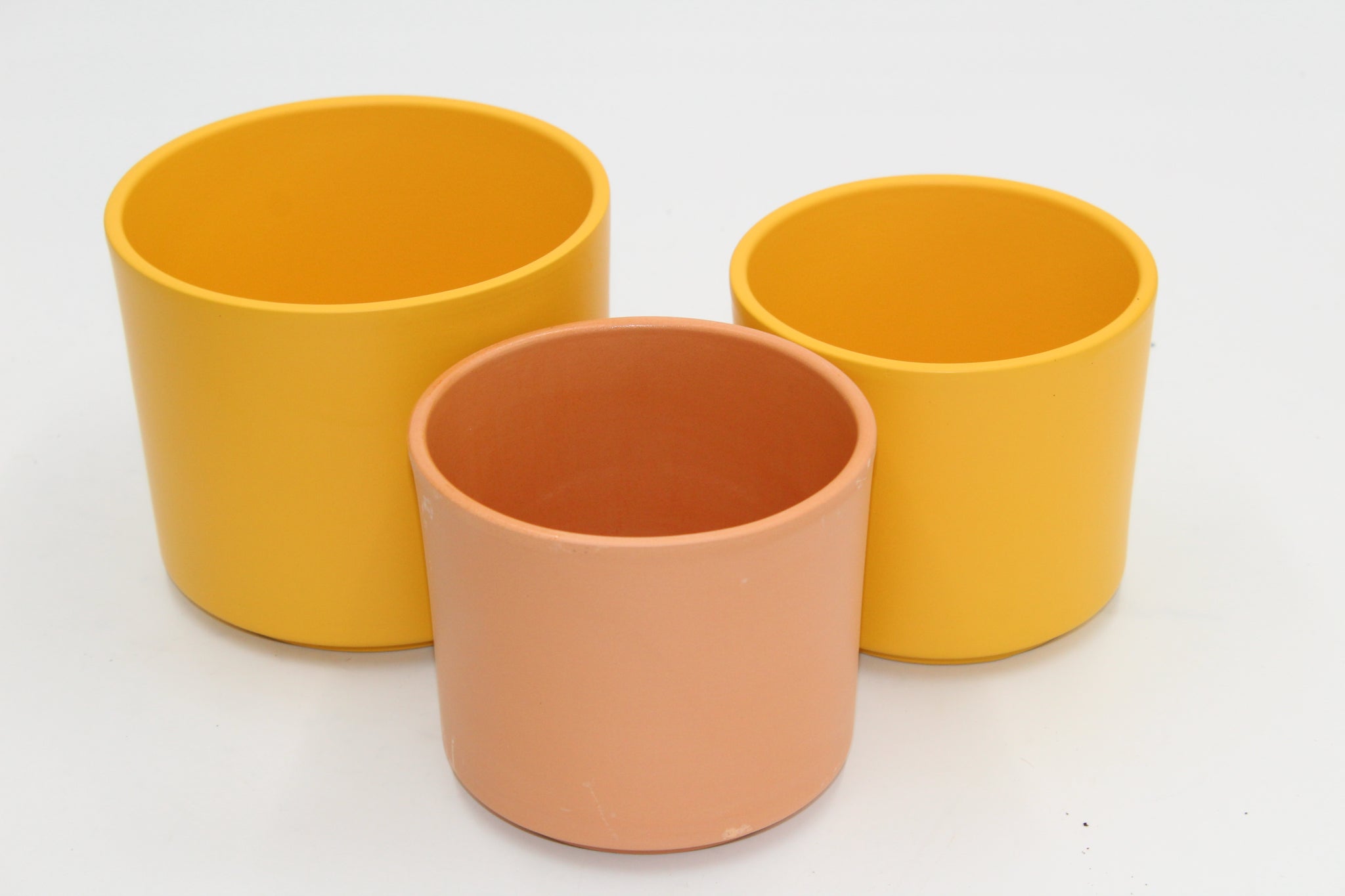 Erhältlich in den Farben Senf und Terrakotta und den Größen 12 cm und 14 cm Durchmesser.