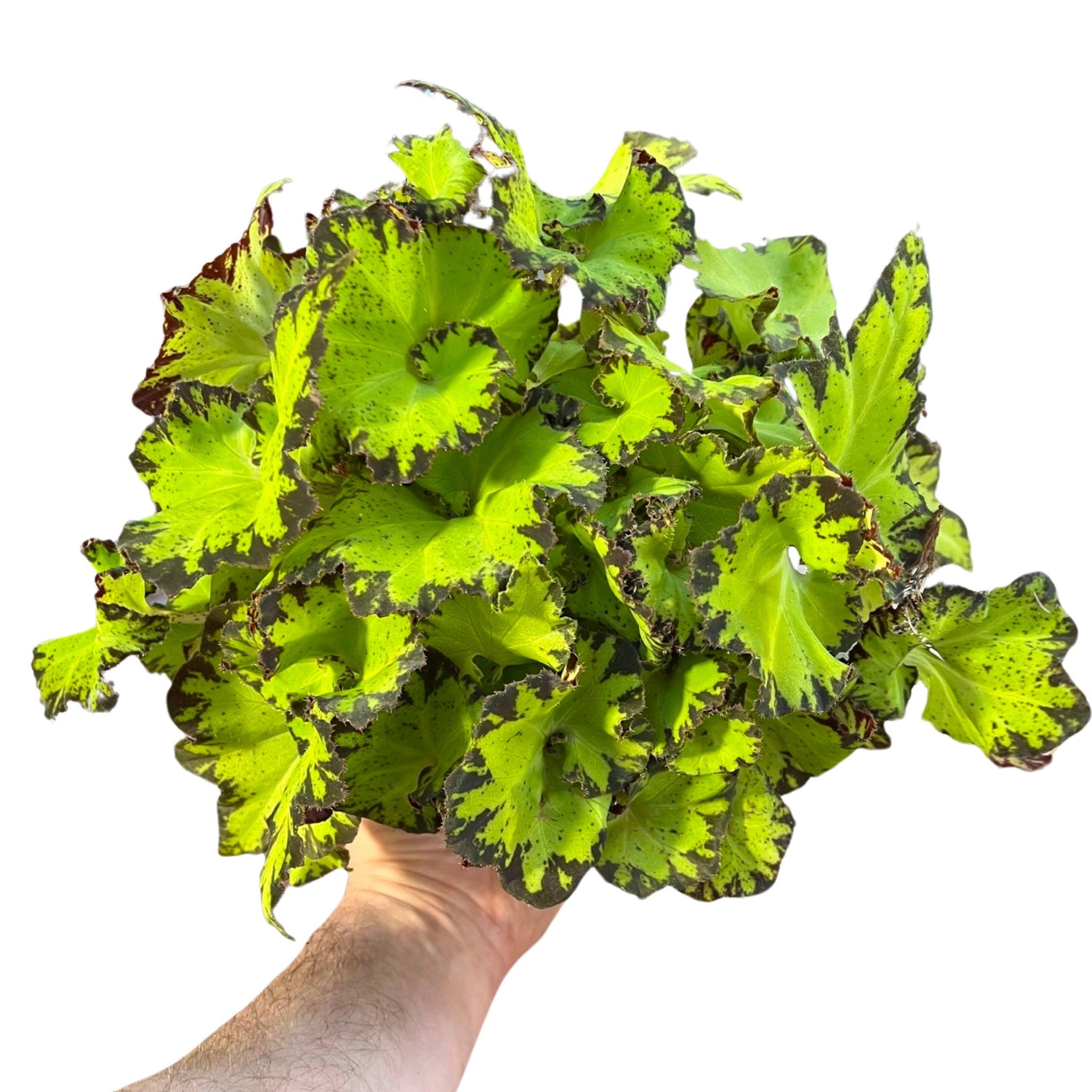 Begonia are part of the Begoniaceae family and are native to SE. Brazil where it grows primarily in the wet tropical biome. ‘Jive’ is a cultivar with chartreuse leaves and red-brown wavy leaf margins. The leaf edges are frilled with tiny, white hairs.