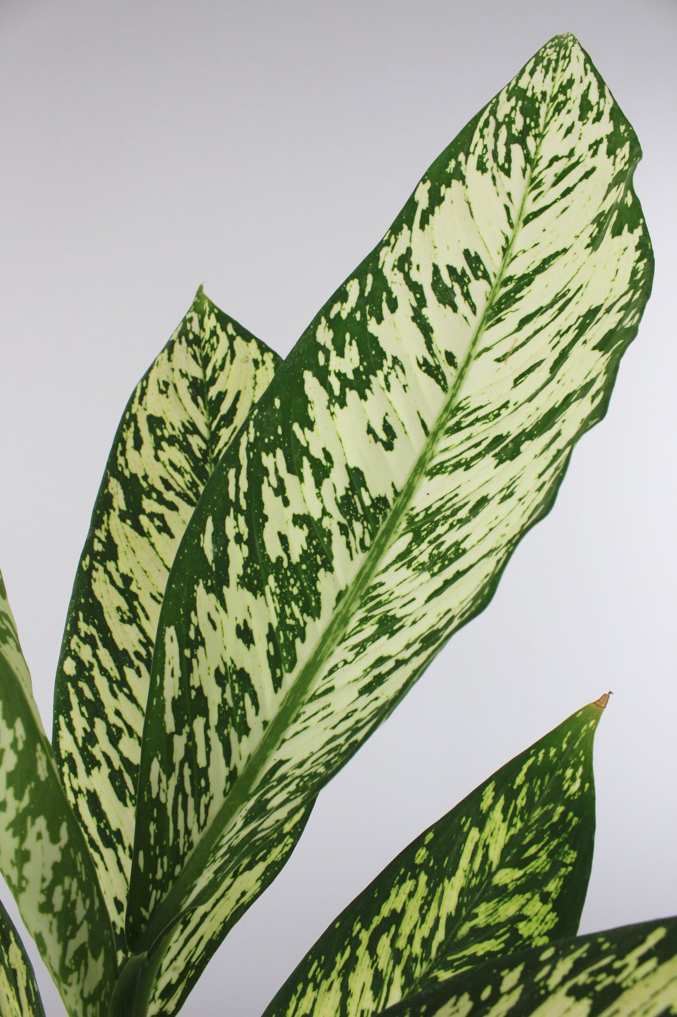 Dieffenbachia is part of the Araceae family and its native range is Mexico to Tropical America. This particular variety has large, paddle shaped leaves with white variegation and green leaf margins.